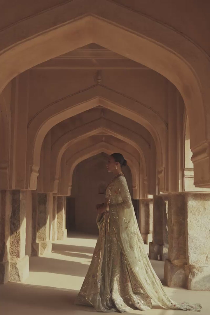 A soft mint lehenga set with a sheesha silk blouse and net sleeves, embellished with kamdani, resham, and zardozi work. The raw silk lehenga features appliqué, mirror work, zardozi, and kora dabka. Styled with either a lama dupatta with hand embroidered borders and kamdani, or a lighter organza dupatta with resham and zardozi detailing.