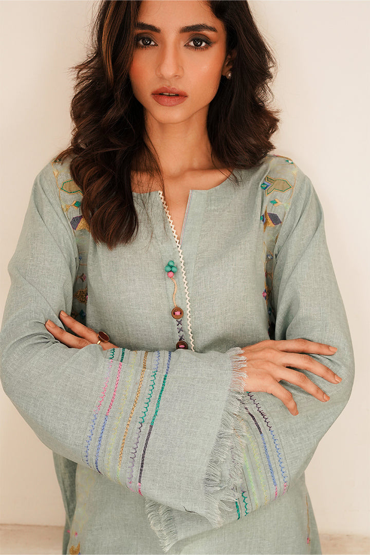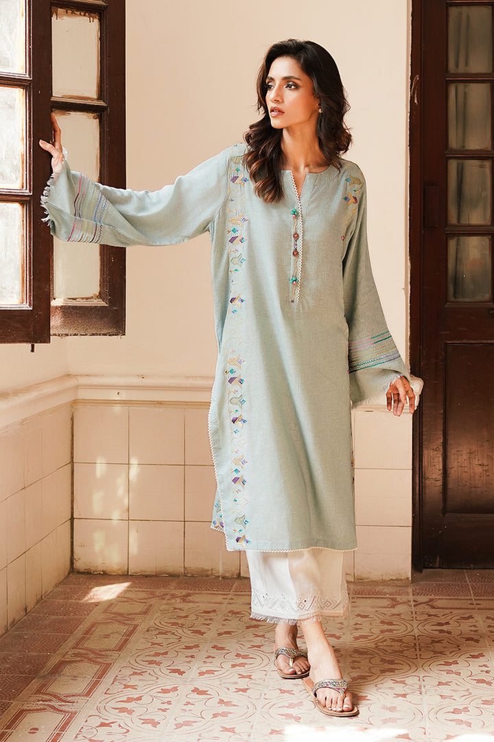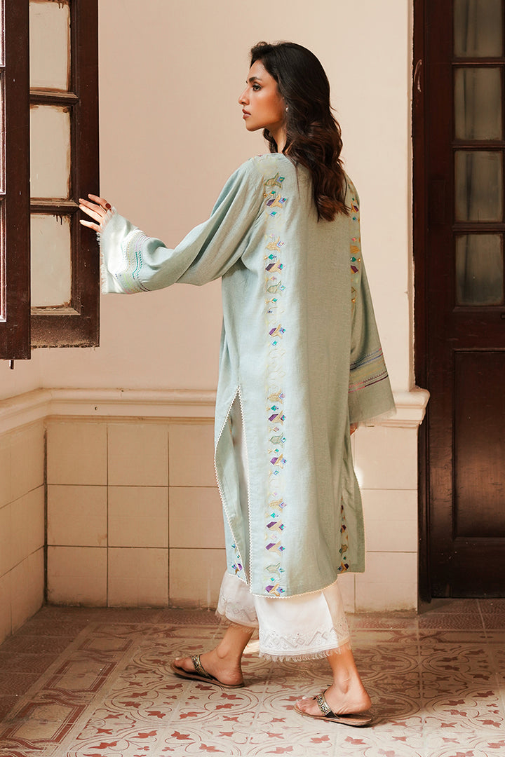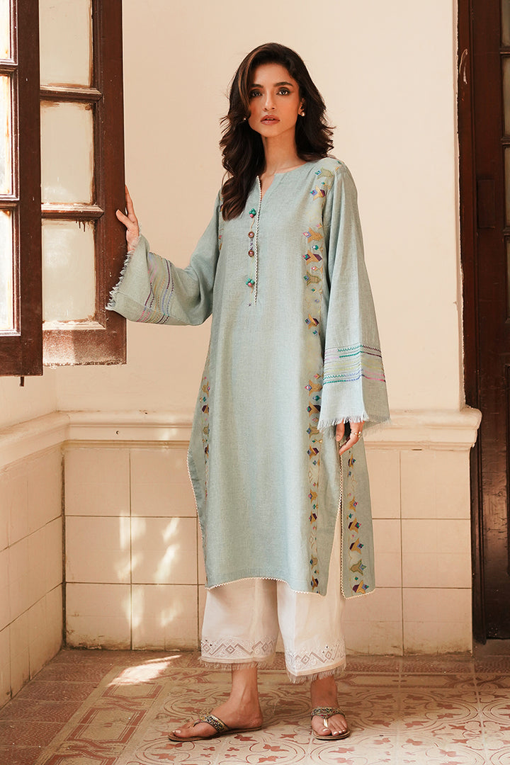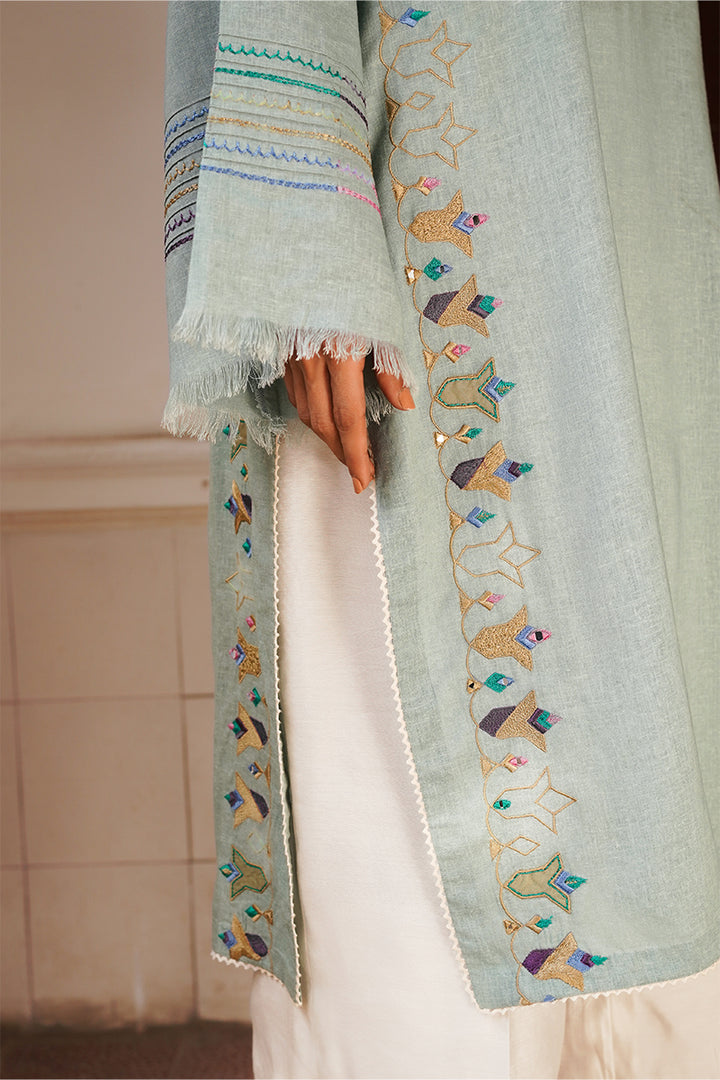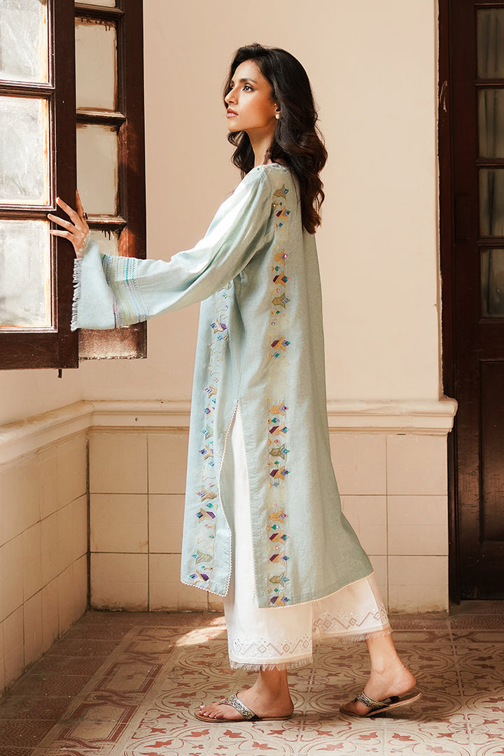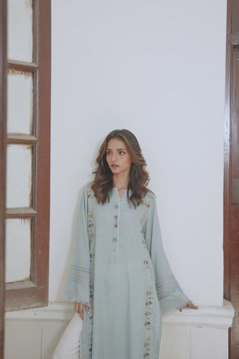 Crafted in soft Irish cotton, this kurta is detailed with resham machine embroidery and delicate mirror work. It features lace accents on the neck, hem, and choks, with hand embroidery on the kurta patti, enhanced by cross-stitch, jute detailing, and buttons. Finished with shredding and pintex edges on the sleeves.