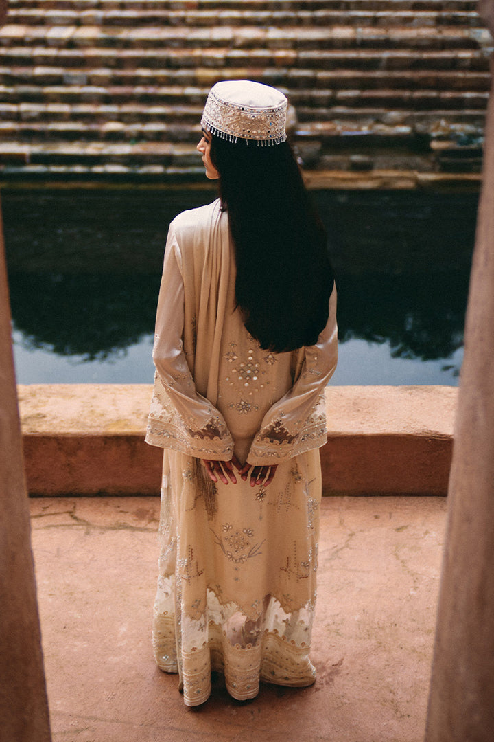 An elegant white kaftan featuring resham machine embroidery, mirror work, applique, and intricate dori detailing. The look is elevated with hand-embellished cut dana and stones, an attached scarf with pearl and cut dana hangings, and a matching skull cap crafted with sheesha silk with exquisite mirror, dori, and hand embroidery.