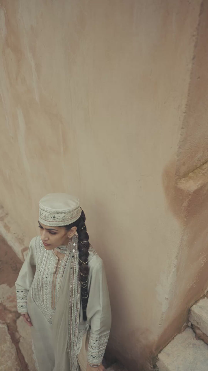 A sage silver toned kaftan featuring resham, mirror, cutwork detailing, and scalloped choks for a soft feminine edge. Styled with a raw silk dhaka pajama for structure and flair. The pure organza dupatta completes the look with intricate resham, ragzin, cutwork, and mirror detailing, finished in Sheesha silk.
