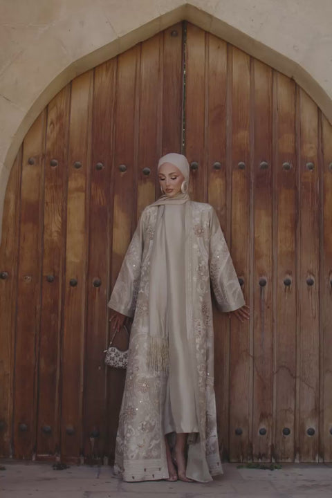 This raw silk jacket features a blend of machine embroidery and intricate handwork. 3D elements, sequins, cutdana, and dabka create layered textures, enhanced further with delicate applique and mirror work. The jacket is finished with pleats that add structure. Paired with a coordinating raw silk inner and a raw silk scarf adorned with handmade hangings.