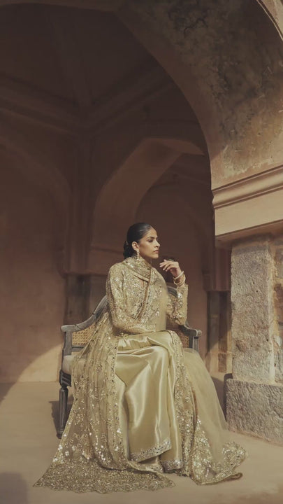 A regal gold front-open organza shirt adorned with intricate mirror work, zardozi, kamdani, and delicate applique detailing. Paired with a satin lama lehenga, featuring a fully hand-embroidered border. The look is completed with a Korean net dupatta embellished with mirror work, hand-embroidered borders, and finished with traditional kiran lace for a classic touch.