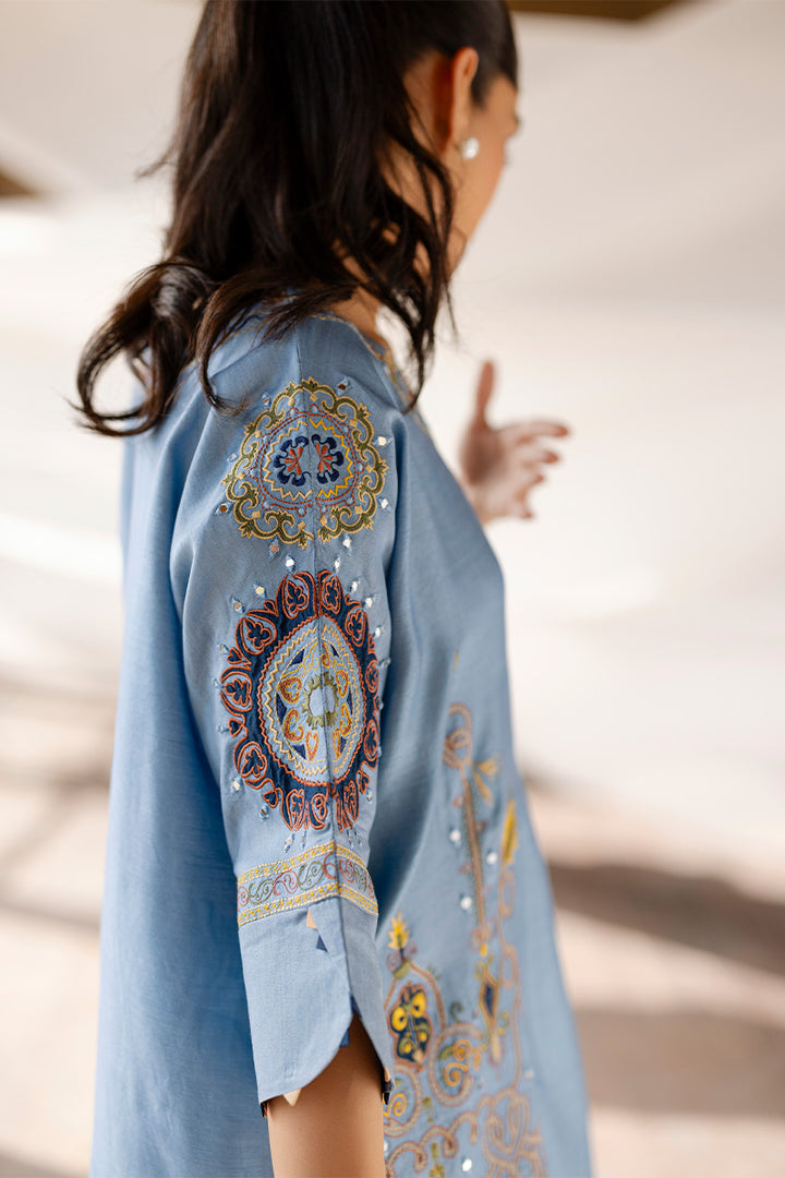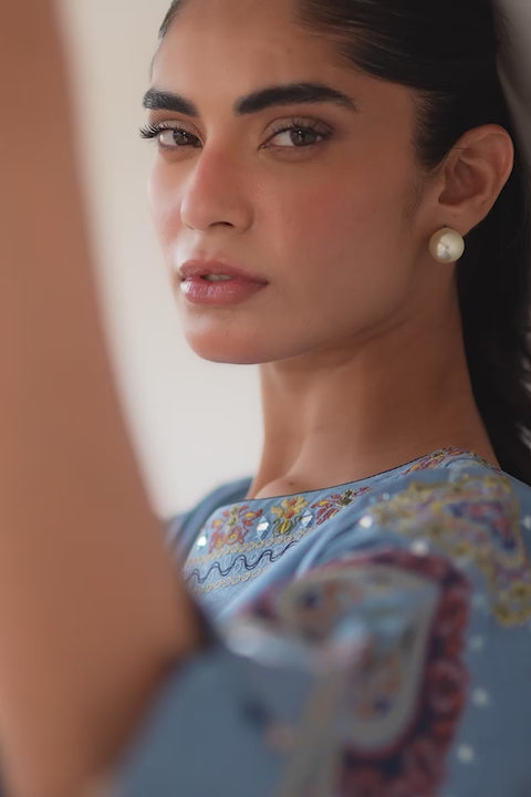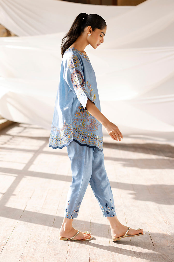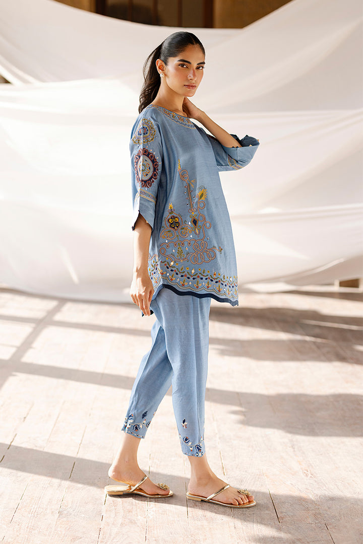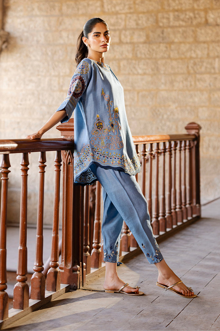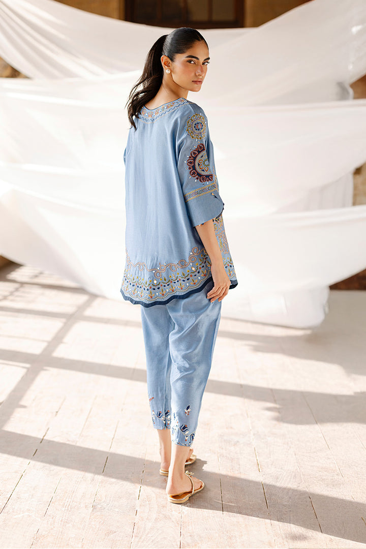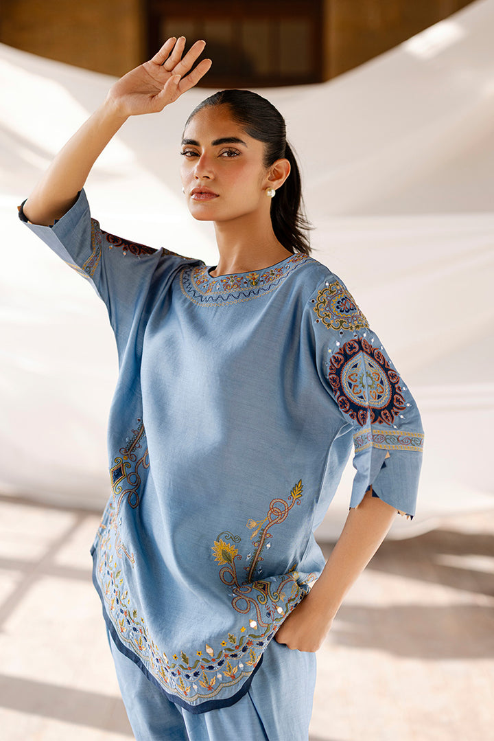 Made in khaddi silk, this blue cord set features a kimono-cut silhouette with appliqué, mirror, and machine embroidery. The hem is adorned with scallop detailing, while corn-finished cuffs add a handcrafted touch. Paired with a mirror and resham embroidered shalwar for a simple yet elegant look.