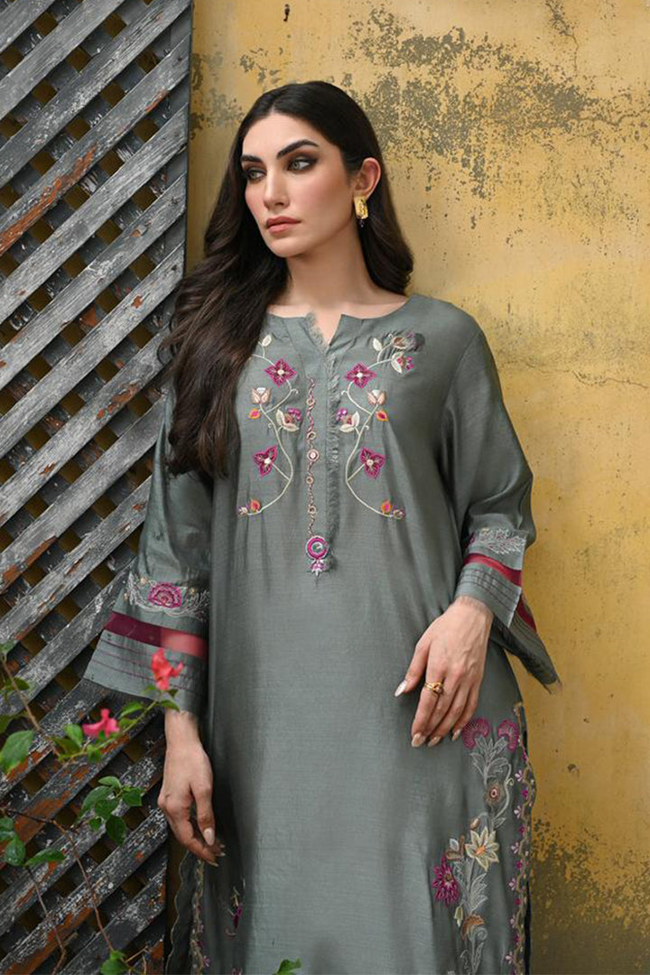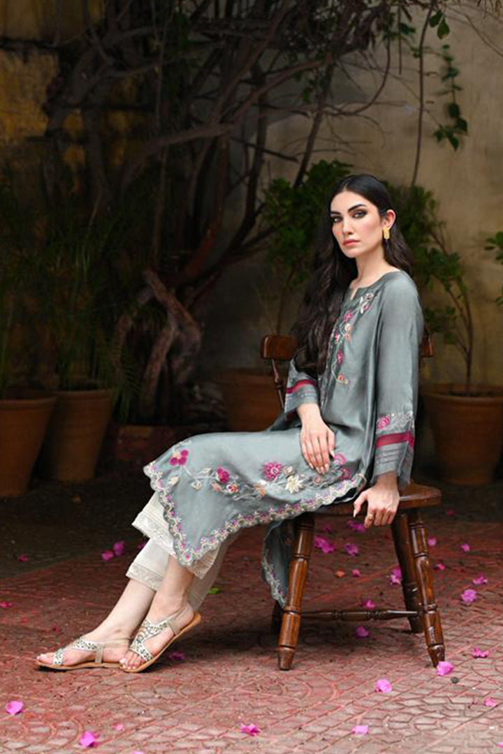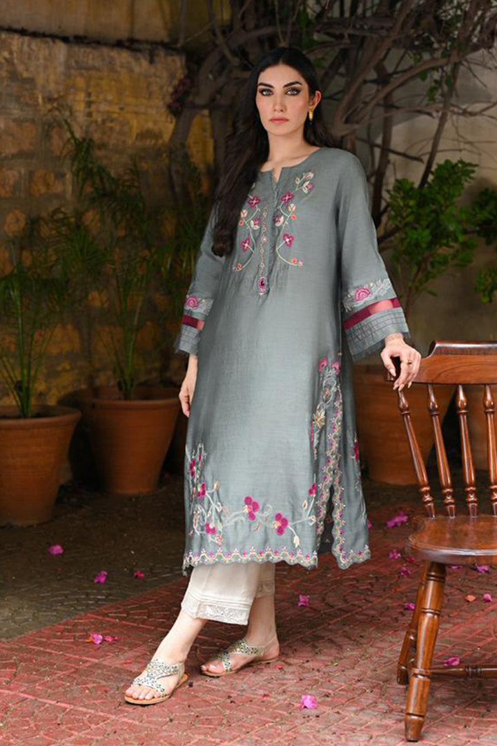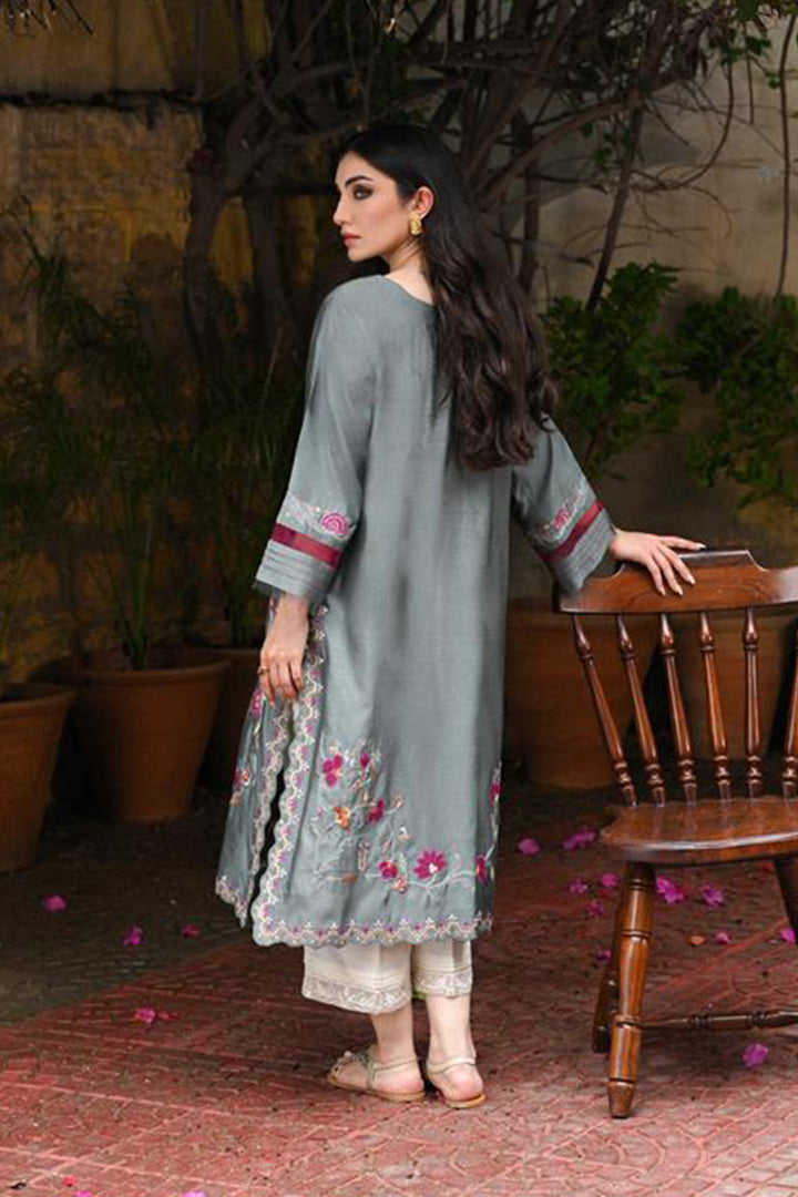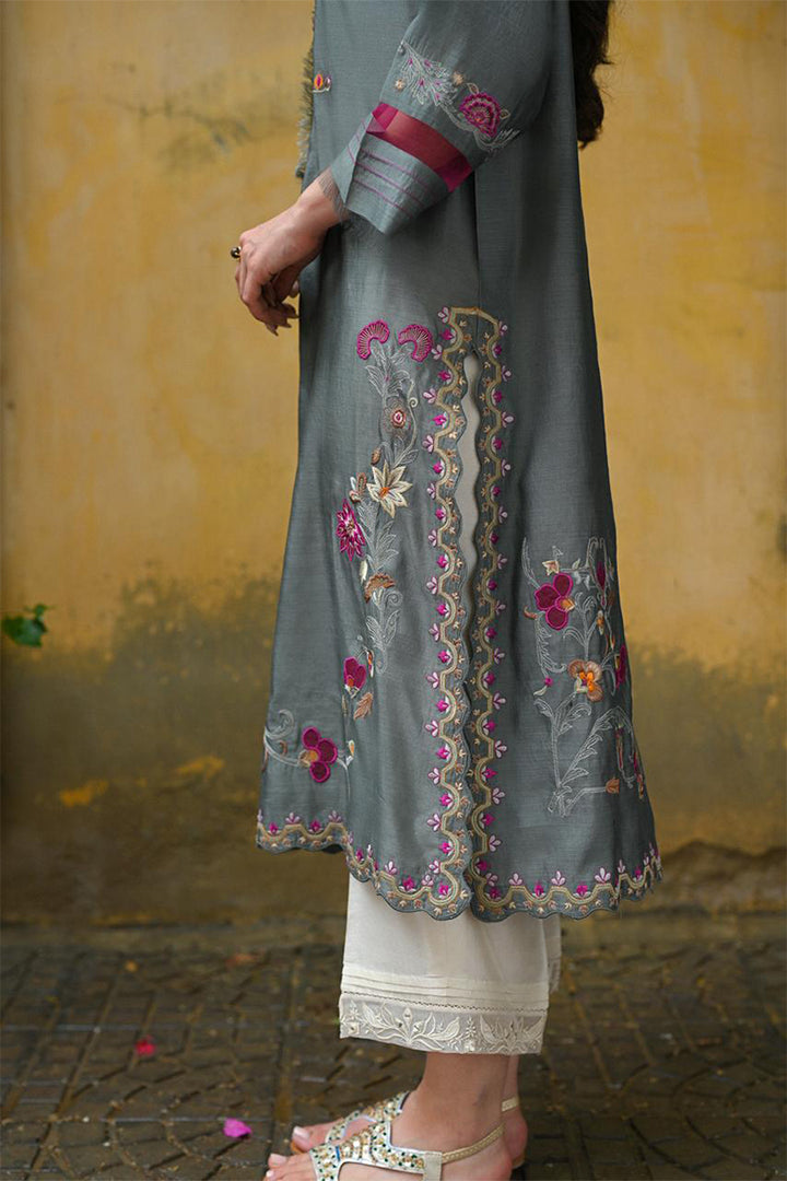 This Khaddi Silk kurta features intricate mirror work, machine embroidery, resham, and appliqué detailing. The neckline stands out with handcrafted jute work. It is designed with pleats and shredding on the sleeves and finished with scalloped edges on the hem and choks. This Kurta blends tradition with modern flair.