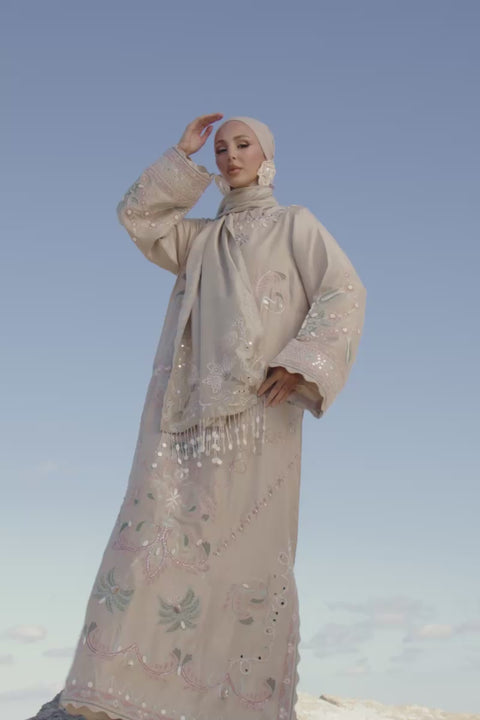 Crafted in raw silk, this ivory kaftan features machine embroidery, mirror work, and applique. Hand embellishments including 3D elements, kora, dabka, cut dana, tiki stones, and sequins add depth and texture. Dori work enhances the design and the silhouette is thoughtfully finished with scalloped detailing along the slit, hem, and sleeves. Paired with a raw silk scarf featuring machine embroidery, dori work, applique, mirror accents, and delicate handmade hangings.
