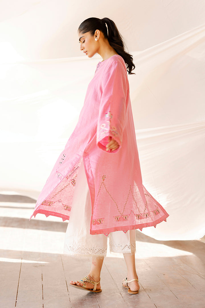 Crafted from soft Irish cotton, this pink kurta features resham embroidery, delicate running stitches. The slit neckline with looped embroidery adds refinement, while triangular cutwork on the daman enhances its graceful charm.