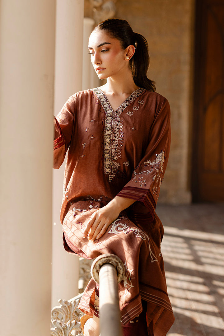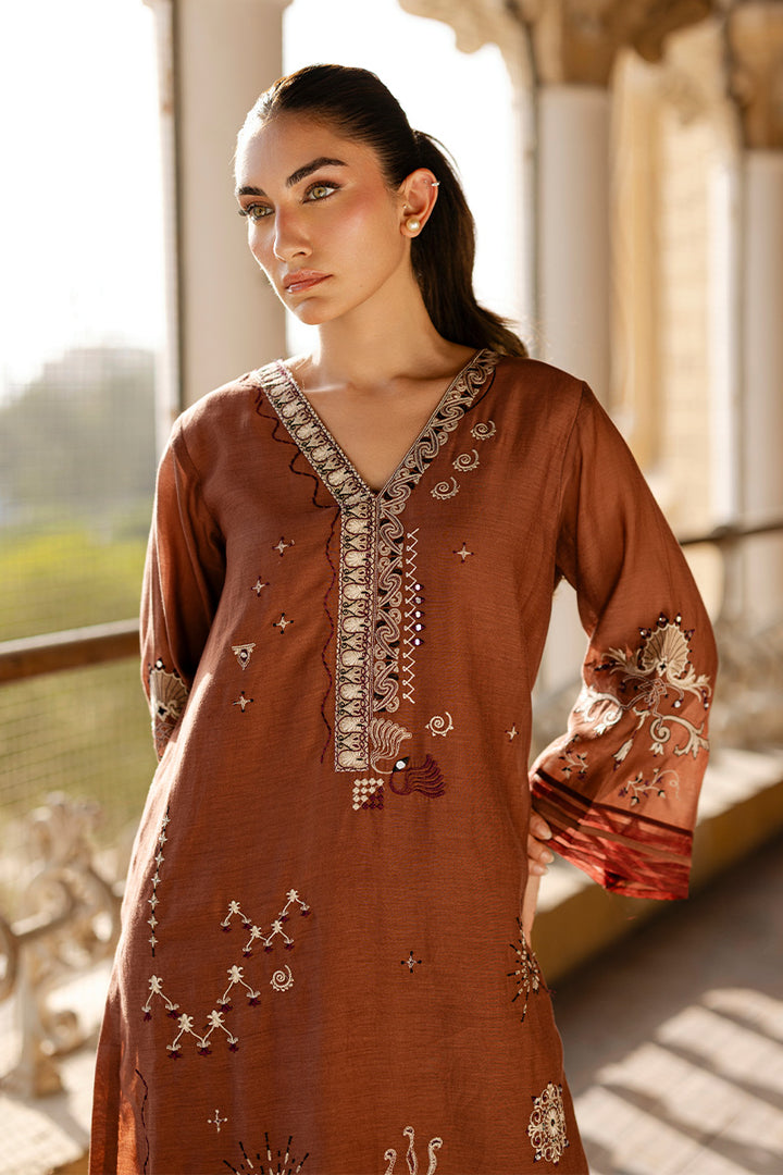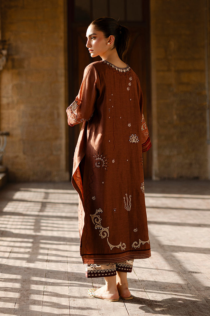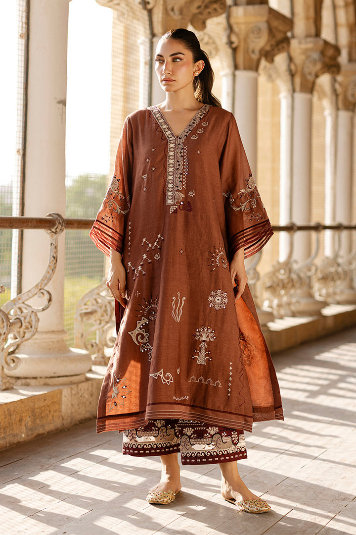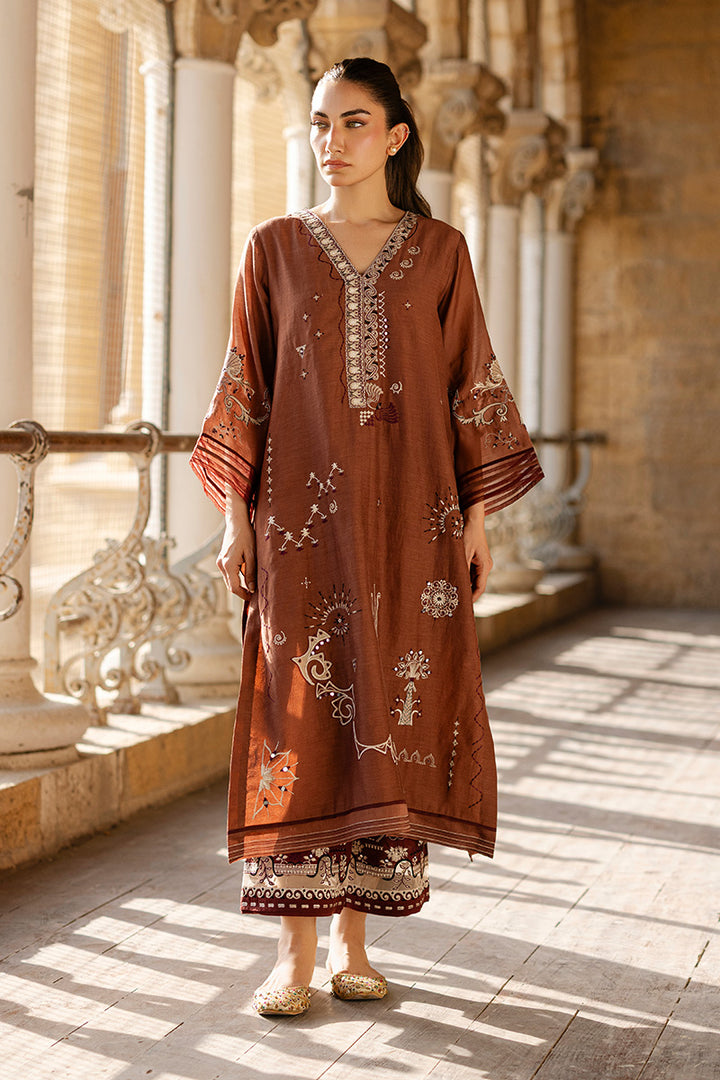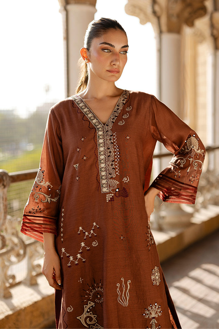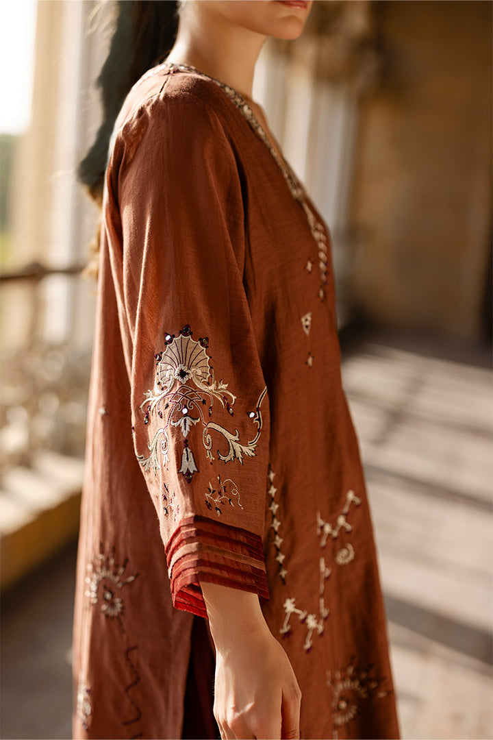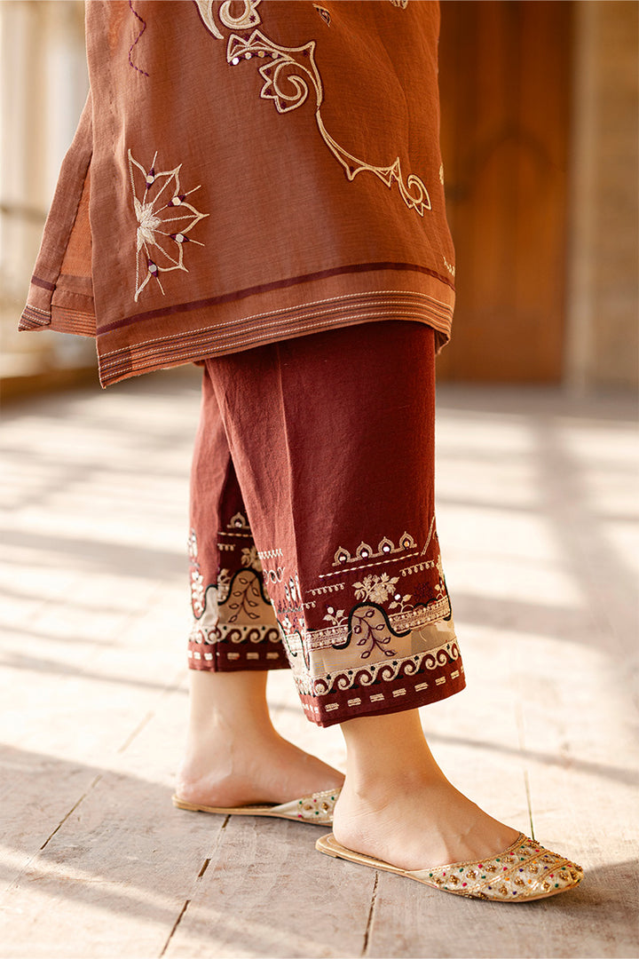 A rich brick brown ensemble crafted in kora cotton, detailed with appliqué, mirror, and resham work. The shirt features pleats with organza accents and delicate machine embroidery. Paired with karandi culottes adorned with resham, shisha, appliqué, and machine embroidery, this set blends texture and tradition