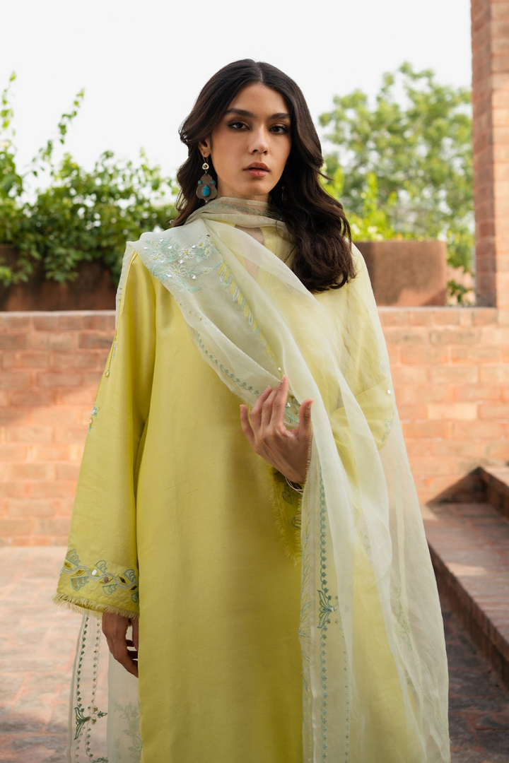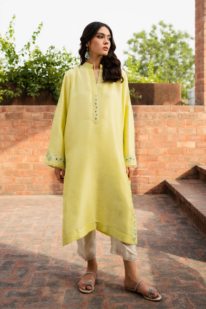 An old school solid lemon kameez features delicately crafted side slits in tonal embroideries and hints of applique and mirror work. Consisting with attractively minimal and chic detailing on the neckline and sleeves. The dupatta is heavily embellished with applique work. The look is completed with our one-of-a-kind organza dupatta that adds a watery soothing tone to Zarah.